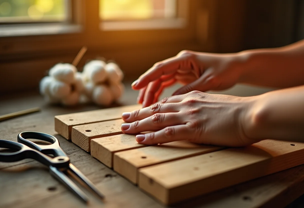 Mãos organizando materiais de artesanato em caixotes de madeira